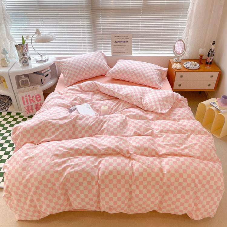 KTX-874643 Cotton Checkerboard Bed Set - 4-Piece Bedding in Blue, Pink, Yellow, Black & White Geometric Design