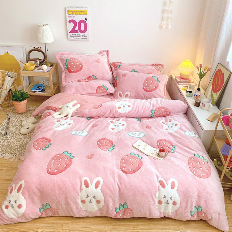 KTX-881235 Cartoon Snow Fleece Bedding Set - 4-Piece Comforter, Sheet, and Pillowcases, Perfect for Cozy Nights