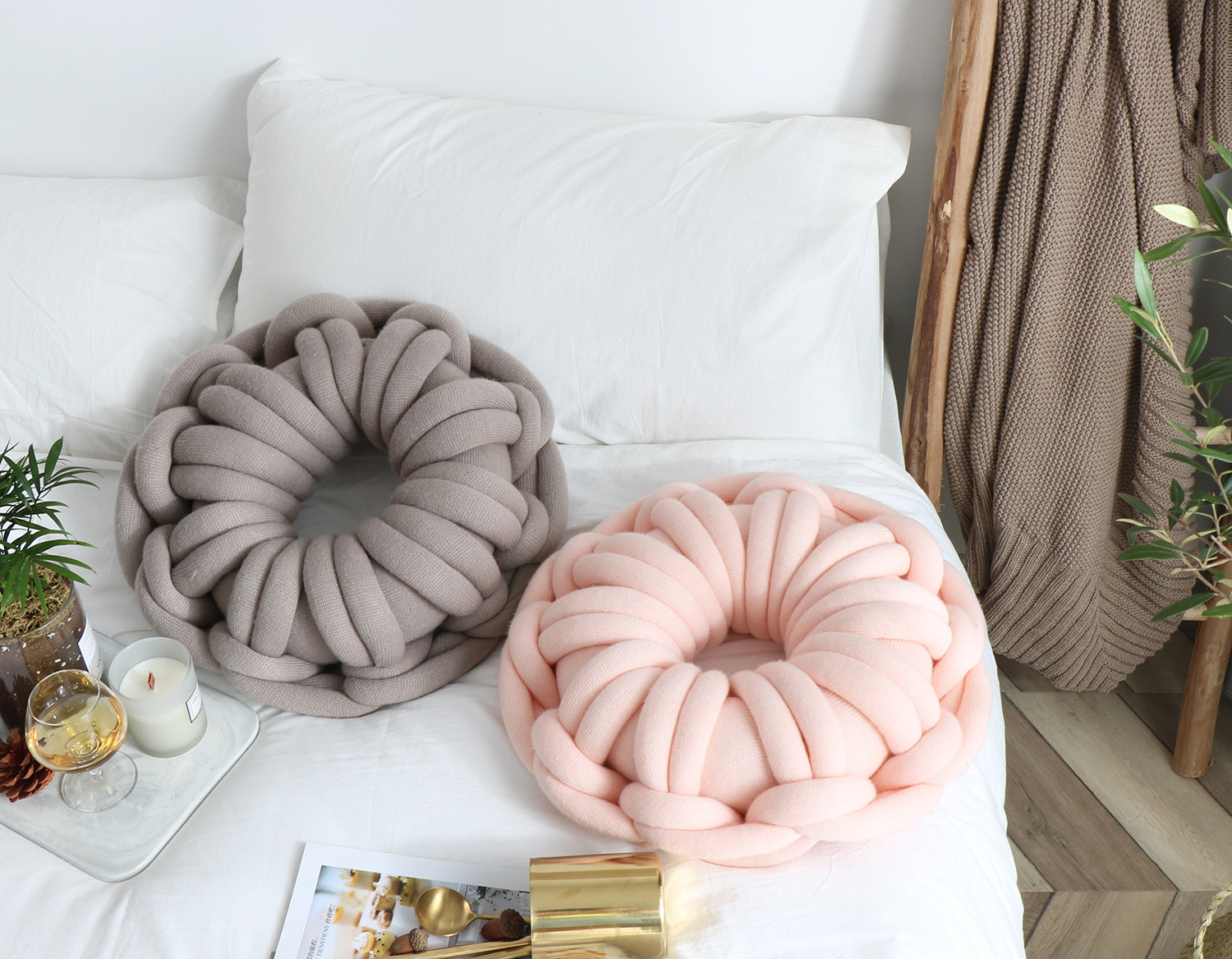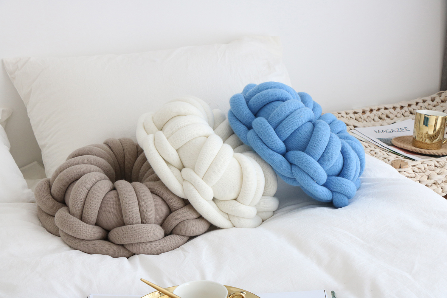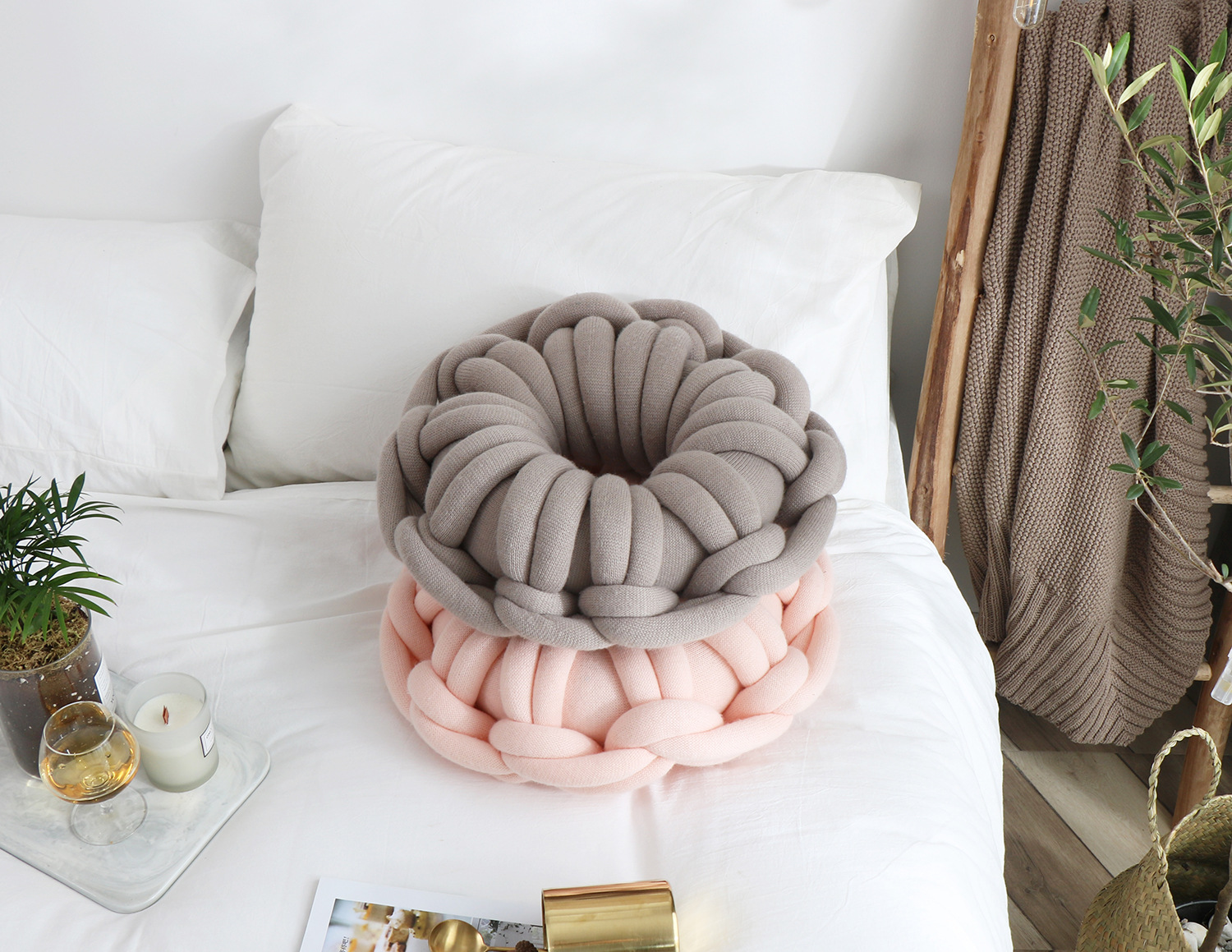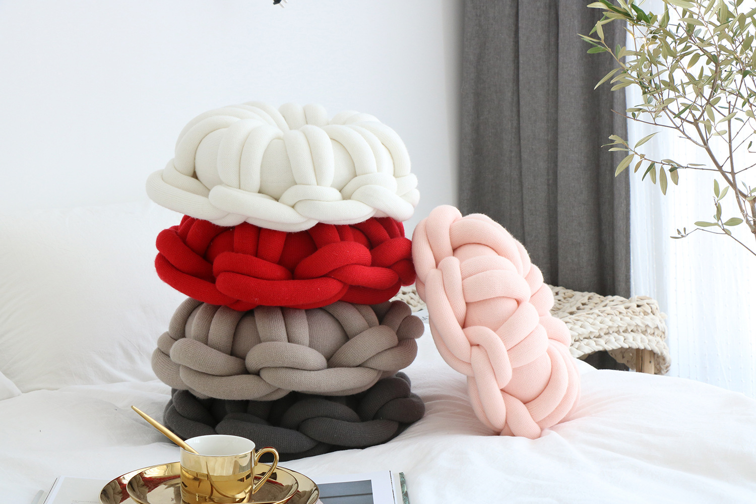 Available in a range of solid colors—including white, red, orange powder, sky blue, iron gray, and camel gray—this pillow is designed to complement various interior styles. Whether you're incorporating it into a cozy reading nook or using it as an accent on your bed or sofa, its knotted ring design creates a unique focal point that is both inviting and visually appealing.