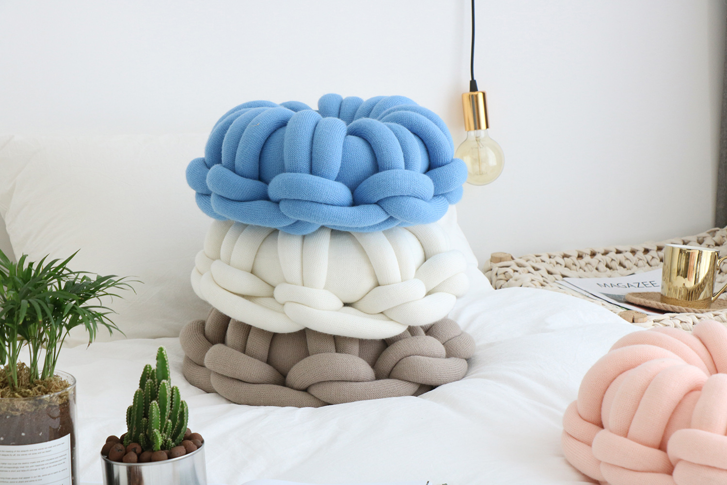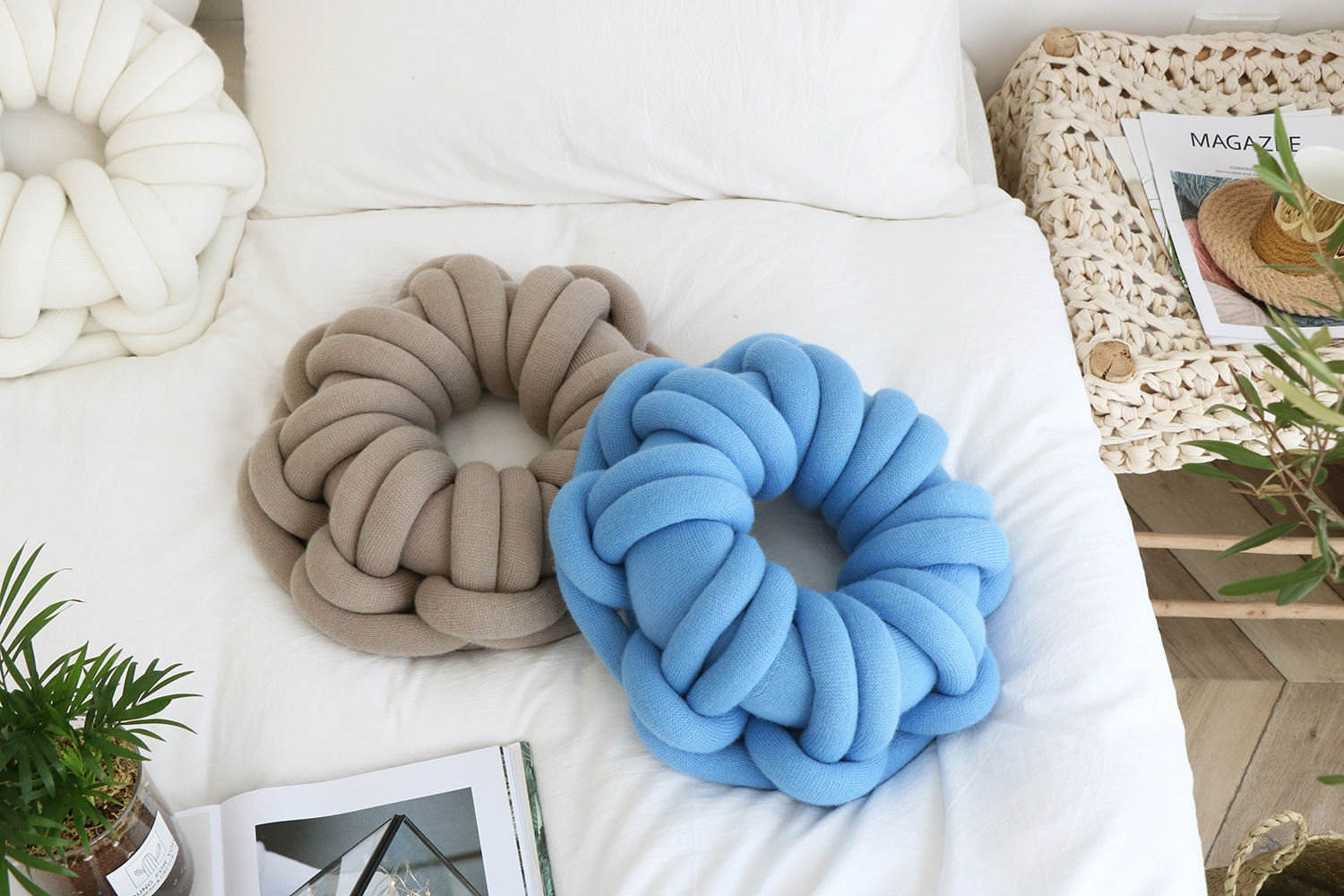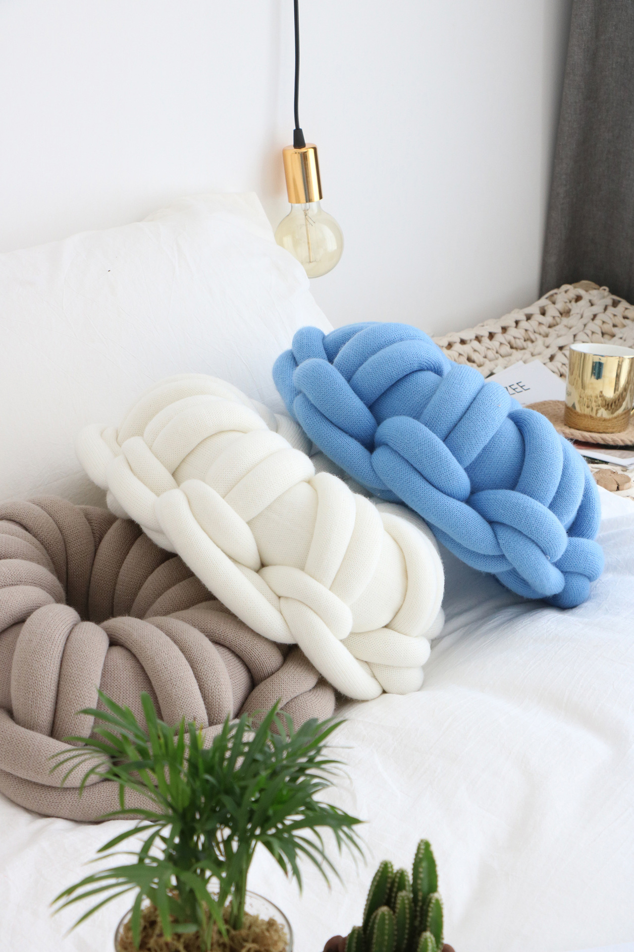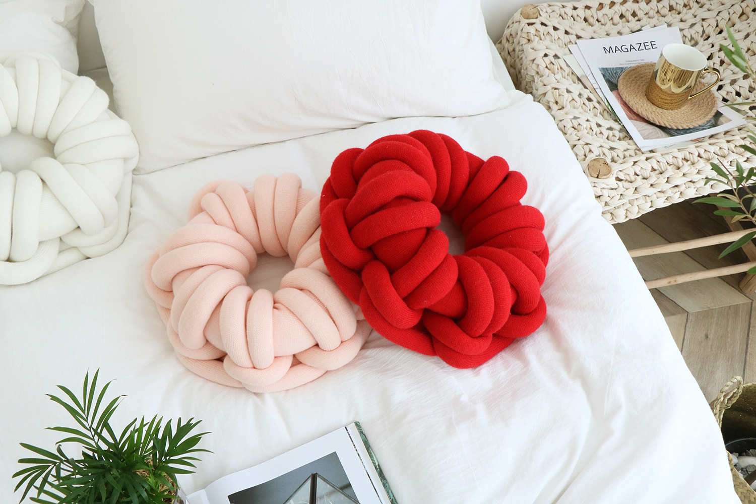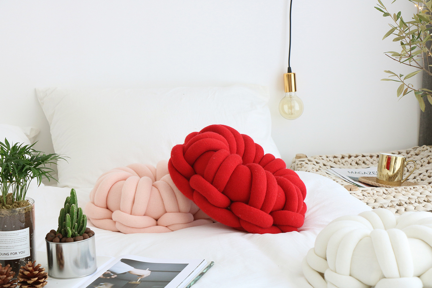 Available in a range of solid colors—including white, red, orange powder, sky blue, iron gray, and camel gray—this pillow is designed to complement various interior styles. Whether you're incorporating it into a cozy reading nook or using it as an accent on your bed or sofa, its knotted ring design creates a unique focal point that is both inviting and visually appealing.