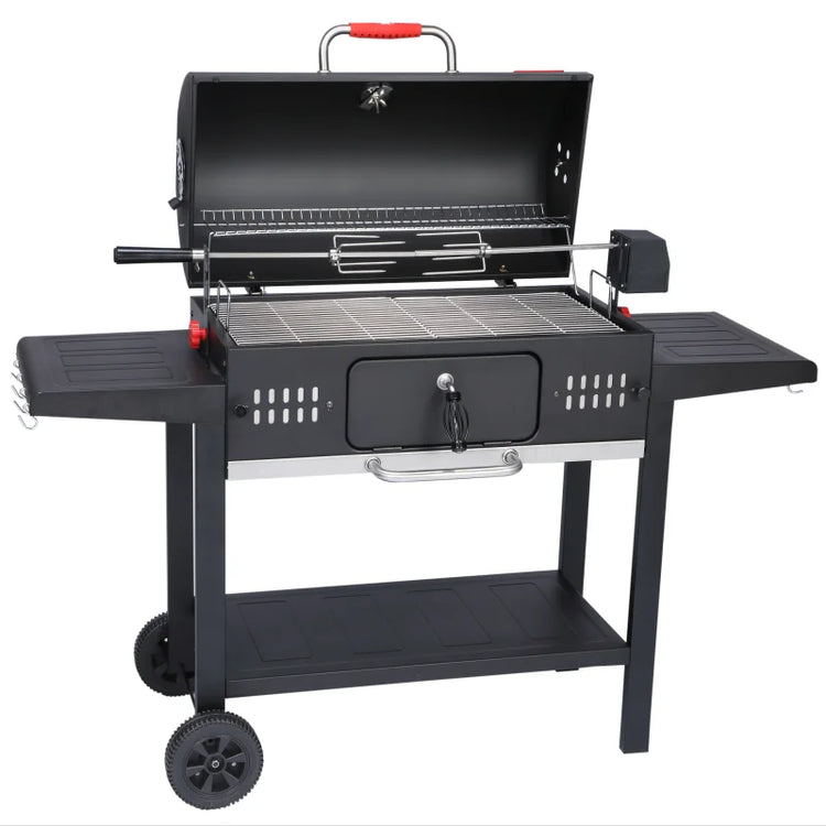 Introducing the KTX-959635 Heavy Duty Pellet Smoker Rotisserie BBQ Charcoal Grill, Model BG033, a versatile grilling solution designed to elevate your outdoor cooking experience. This charcoal grill features a robust built-in design and a convenient trolley option, making it perfect for both stationary and on-the-go barbecuing.
