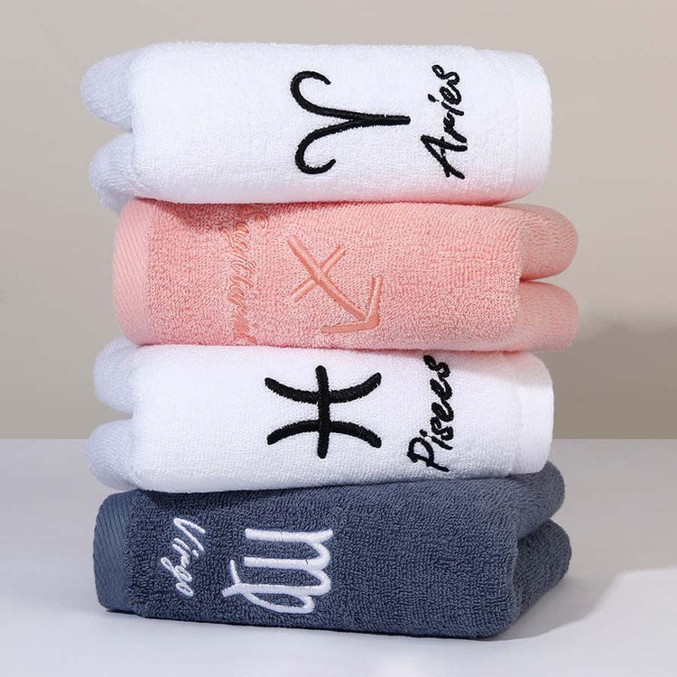 Available in a delightful range of colors including White, Blue, and Pink, this towel offers a variety of options for different zodiac signs such as Aries, Cancer, Virgo, Taurus, Capricorn, Sagittarius, Leo, Pisces, Gemini, Aquarius, Libra, and Scorpio. This thoughtful selection ensures you can find the perfect match for your personal style or gift it to a loved one who cherishes their astrological sign.