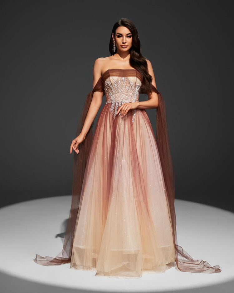 Introducing the KTX-233171 Elegant Brown Evening Gown for Women - Style EZ25017, a beautifully designed gown that adds a touch of sophistication to any formal occasion. This elegant piece is perfect for galas, wedding receptions, or any evening event where you want to make a stylish statement.