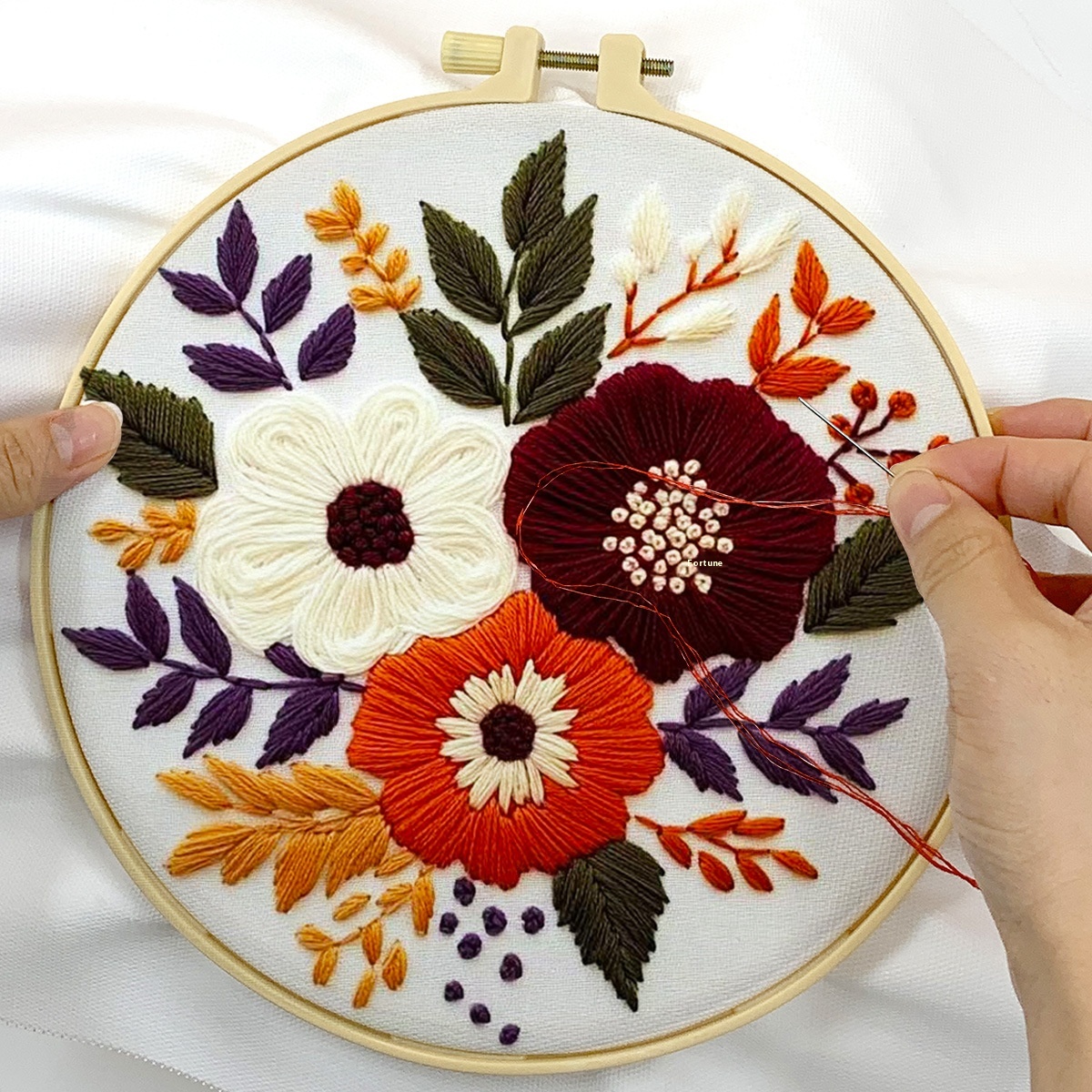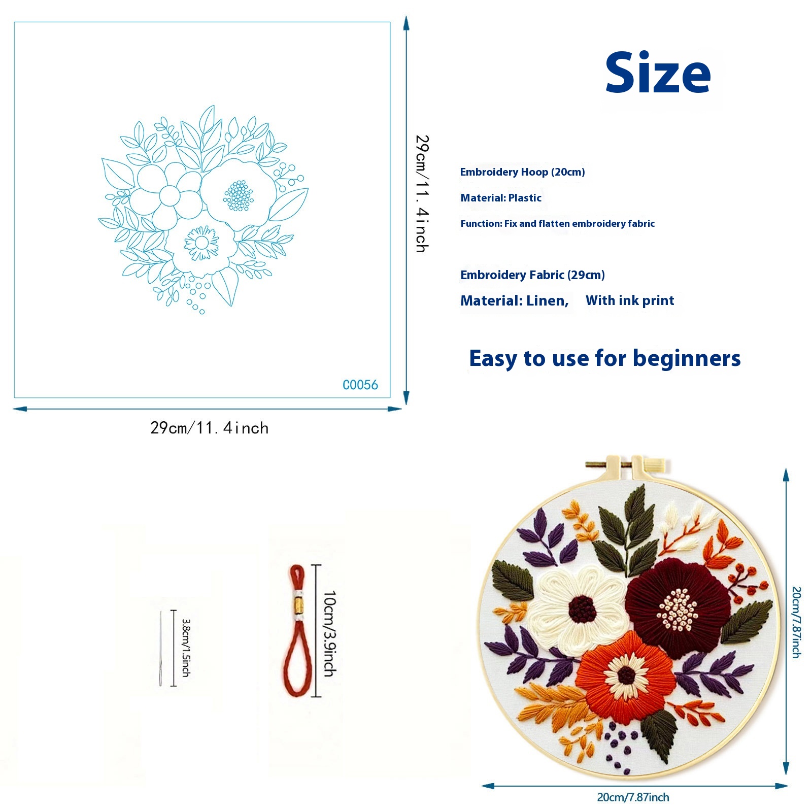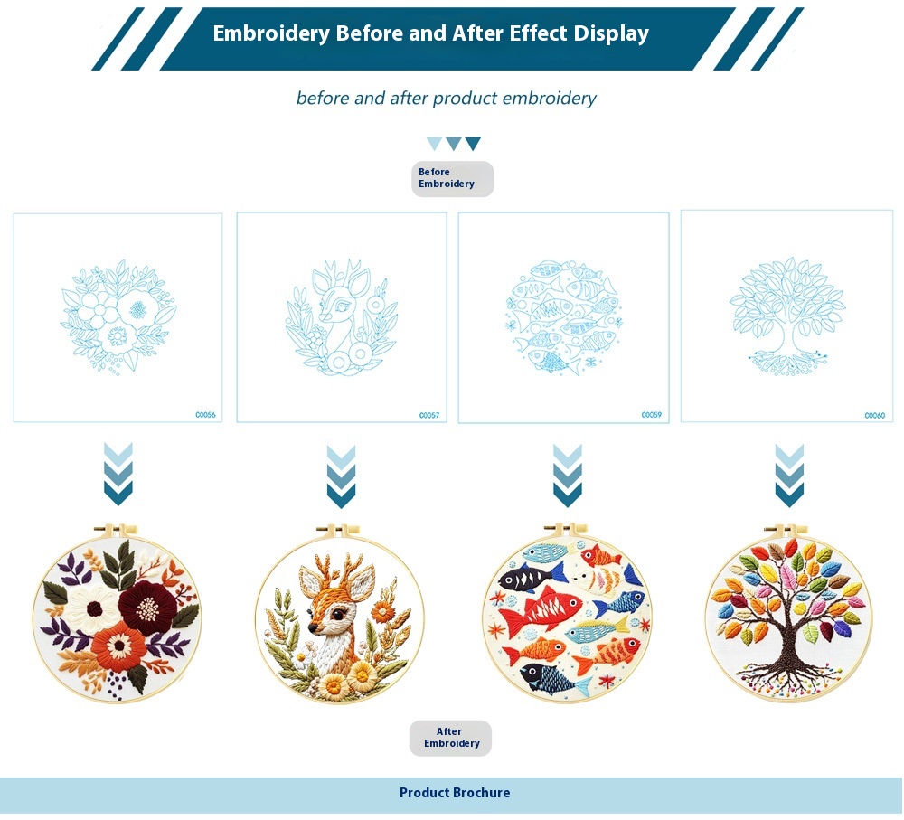 These embroidery kits come complete with quality cotton cloth in a classic white hue, providing a modern simplicity that easily complements your decor. Each pattern measures 29x29cm and is paired with a convenient round embroidery frame sized at 20x20cm, ensuring you have everything you need to get started on your stitching adventure right out of the box.