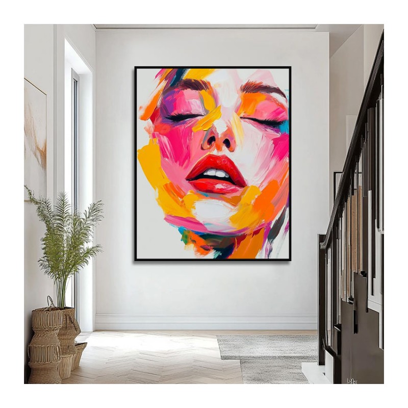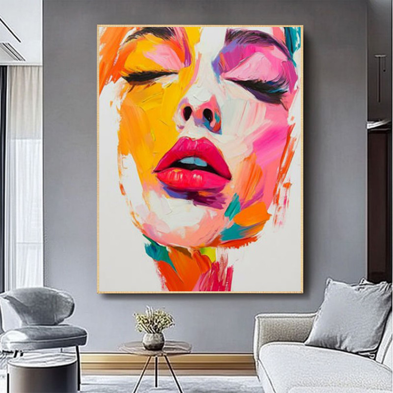 KTX-778259 Handmade Oil Painting on Canvas - Modern Abstract Human Face Wall Art for Living Room Decor - Unstretched Frameless Design
