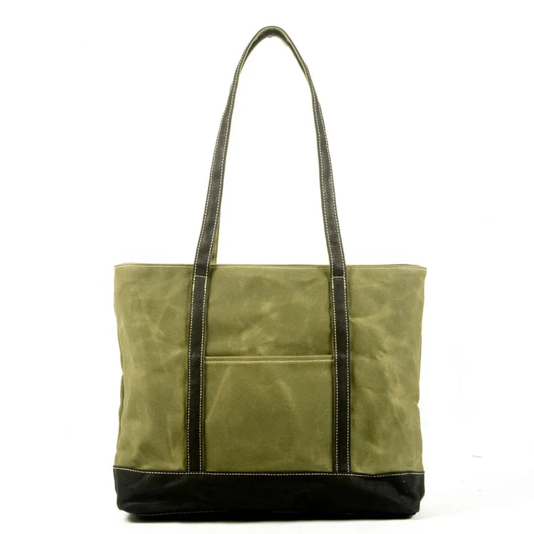 KTX-774931 Waterproof Oil Wax Canvas Shoulder Tote Bag with Cowhide Trimmings, Large Capacity