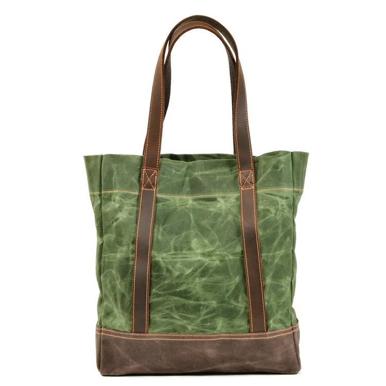 KTX-774931 Waterproof Oil Wax Canvas Shoulder Tote Bag with Cowhide Trimmings, Large Capacity
